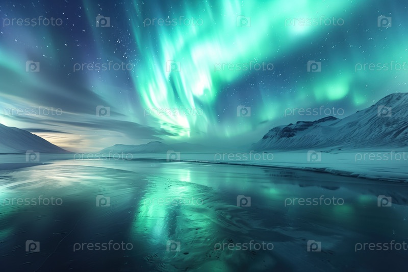 Северное сияние над фьордом зимой