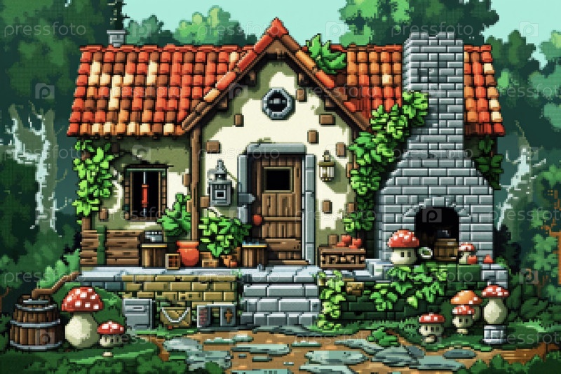 Пикселизированный фон в стиле 8-битных видеоигр с фэнтезийным домом
