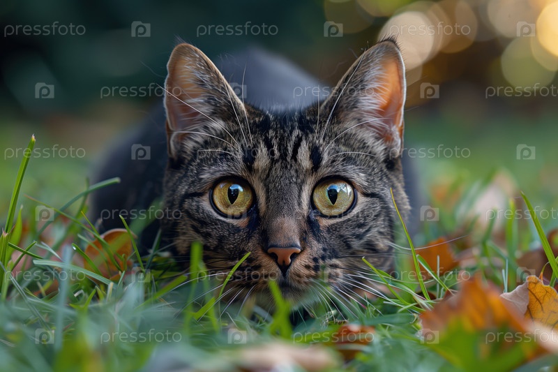 Полосатый кот охотится на улице среди травы