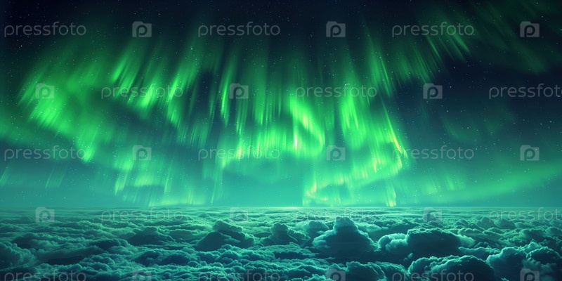Северное сияние, северное сияние в небе над облаками, вид сверху