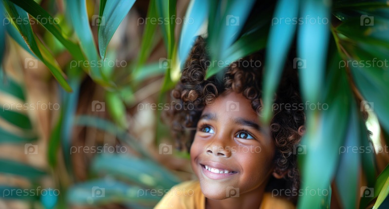 Счастливый африканский ребенок среди тропической растительности, детей и природы
