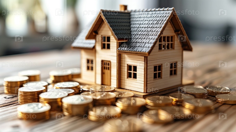 Модель дома и монеты на деревянном столе, концепция инвестиций в недвижимость