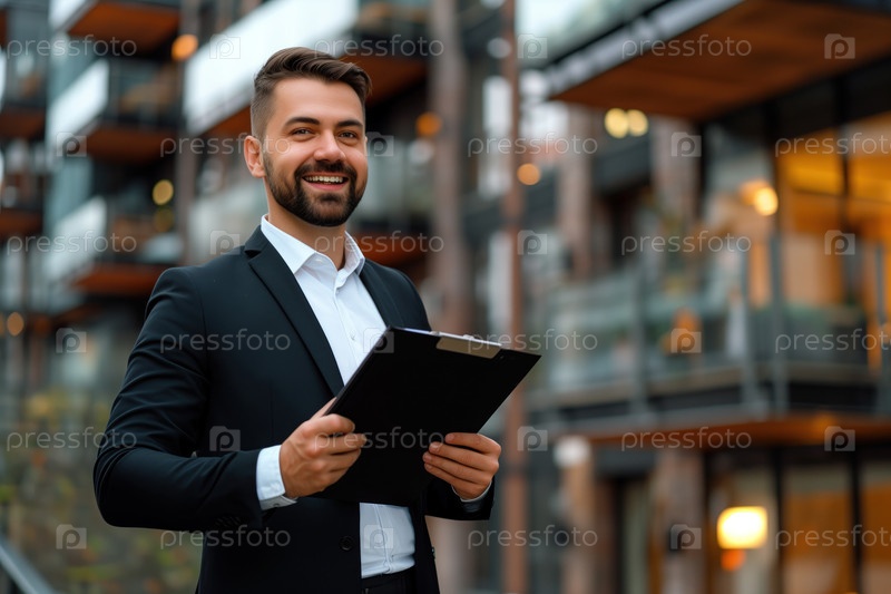 Портрет улыбающегося бизнесмена с планшетом на фоне современного жилого здания