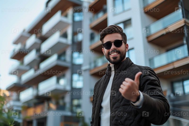 Портрет красивого молодого человека, показывающего большой палец вверх, на фоне современного многоквартирного дома