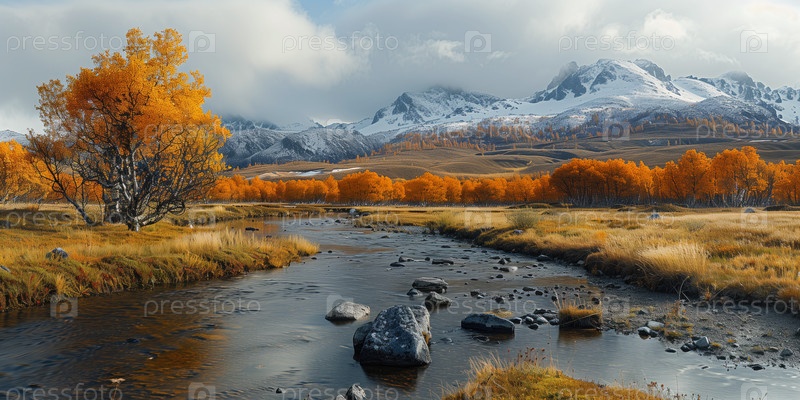 Красивый осенний горный пейзаж с чистой рекой на переднем плане