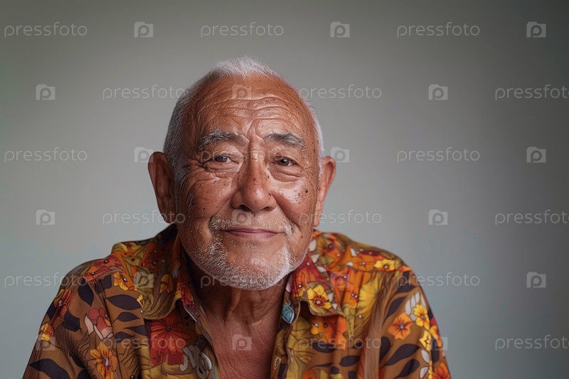 Портрет улыбающегося азиатского пожилого мужчины на сплошном сером фоне