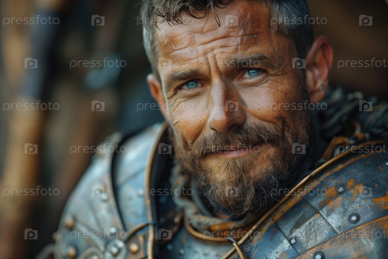 Портрет средневекового рыцаря в доспехах крупным планом на размытом фоне