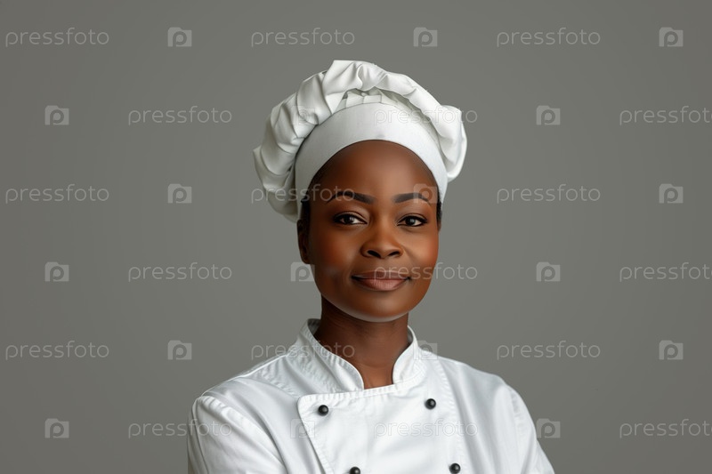 Портрет молодой афроамериканки-повара на сером фоне