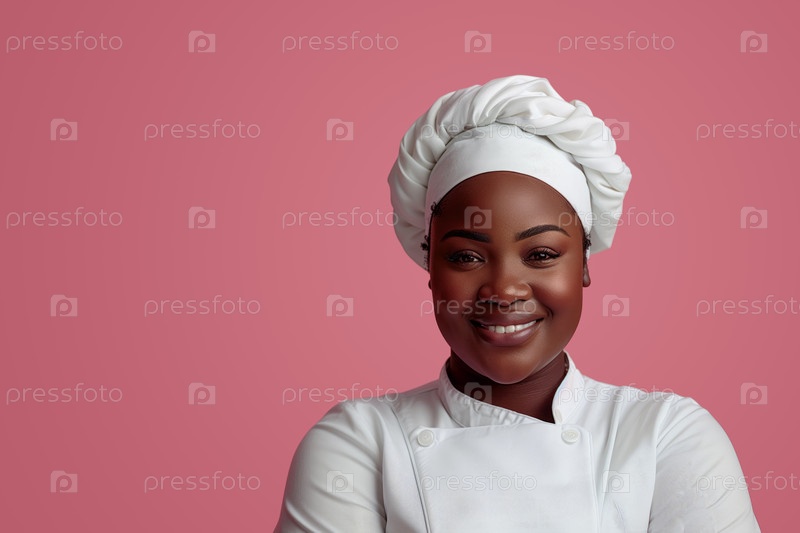 Портрет улыбающейся афроамериканской женщины-повара на розовом фоне