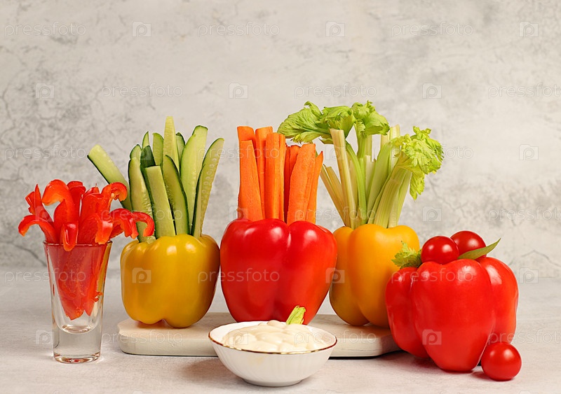Овощные палочки в болгарском перце и соусе для похудения, прерывистое голодание. Концепция сыроедения и диетическое питание, Здоровый завтрак с ингредиентами, меню для кафе или ресторана, кухонный фон,