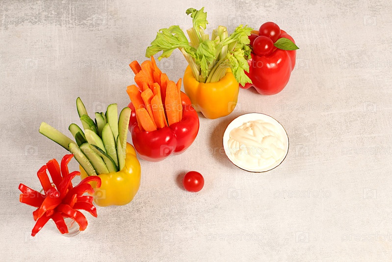 Овощные палочки в болгарском перце и соусе для похудения, прерывистое голодание. Концепция сыроедения и диетическое питание, здоровый завтрак с ингредиентами, меню для кафе или ресторана, фон кухни