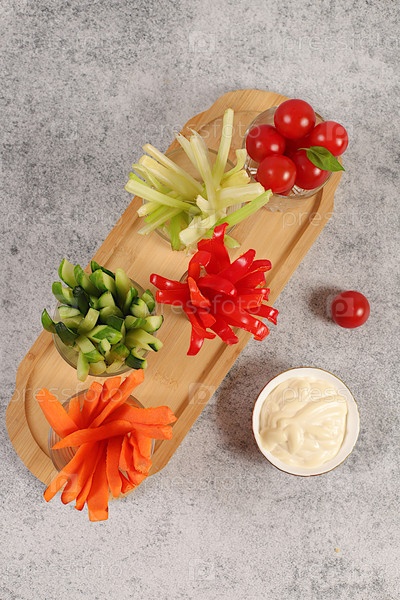 Концепция сыроедения и диетическое питание, овощные палочки в стеклянных стаканчиках и соус для похудения, прерывистое голодание. Здоровый завтрак с ингредиентами, меню для кафе или ресторана, кухонный фон,