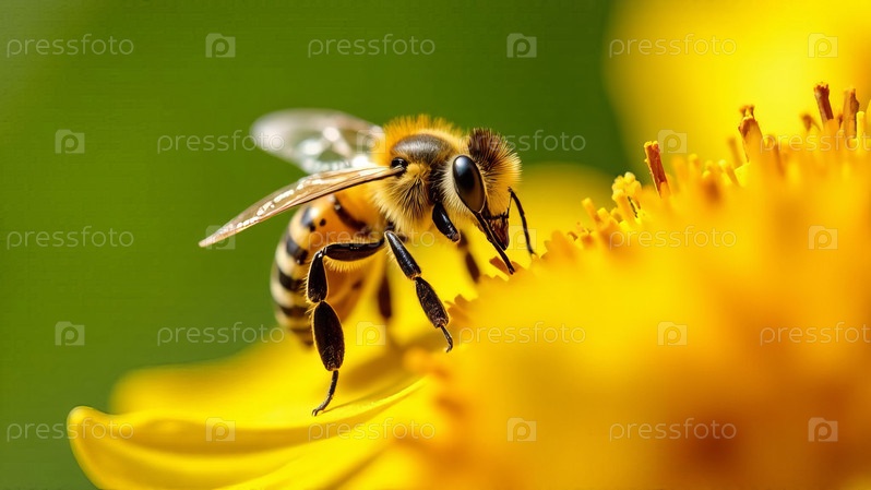 Медоносная пчела опыляет ярко-желтый цветок
