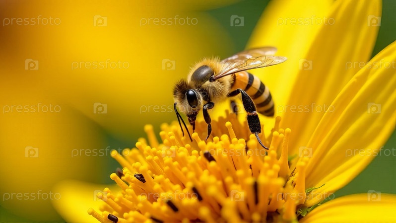 Медоносная пчела опыляет ярко-желтый цветок