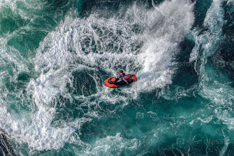 Вид с воздуха на катание на гидроциклах. Водовороты водоворота Сальтстраумен, Нурланд, Норвегия