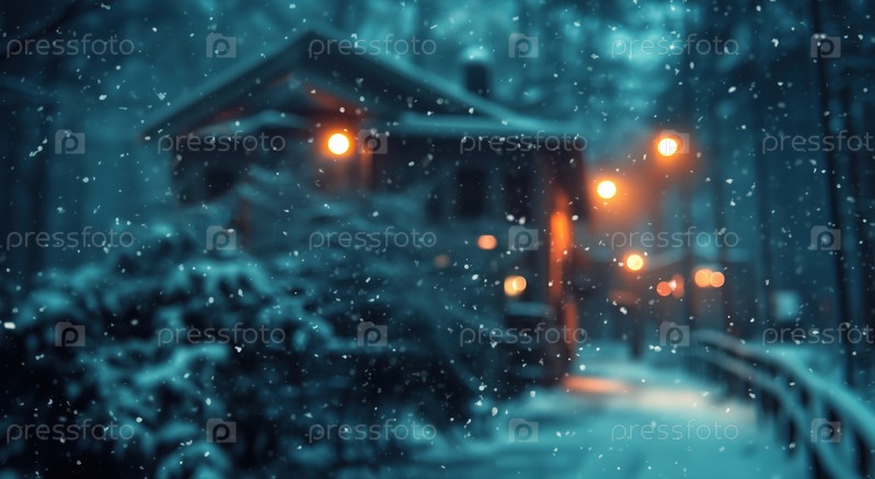 Размытая зимняя ночная деревня, снежный фон, пейзаж