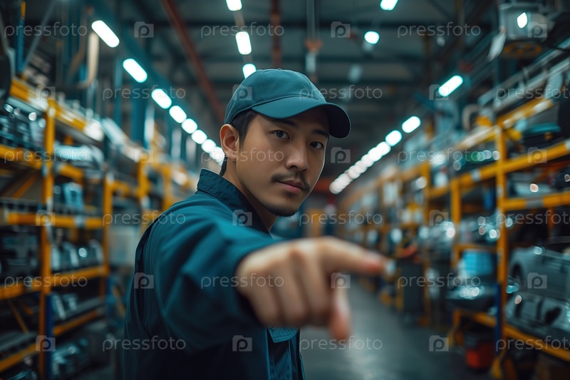 Портрет азиатского мужчины-работника в униформе, смотрящего в камеру и указывающего пальцем на складе, занимающегося грузоперевозками и дистрибуцией