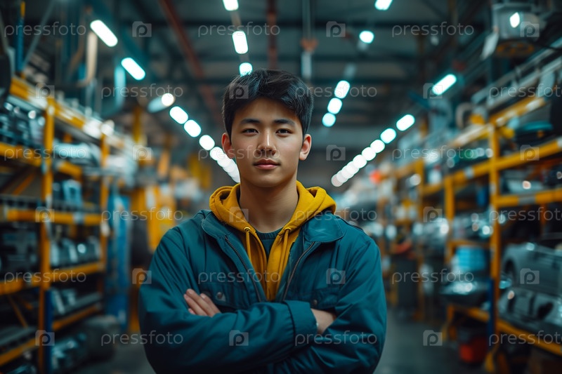 Портрет молодого азиата в синей куртке, стоящего со скрещенными руками на складе