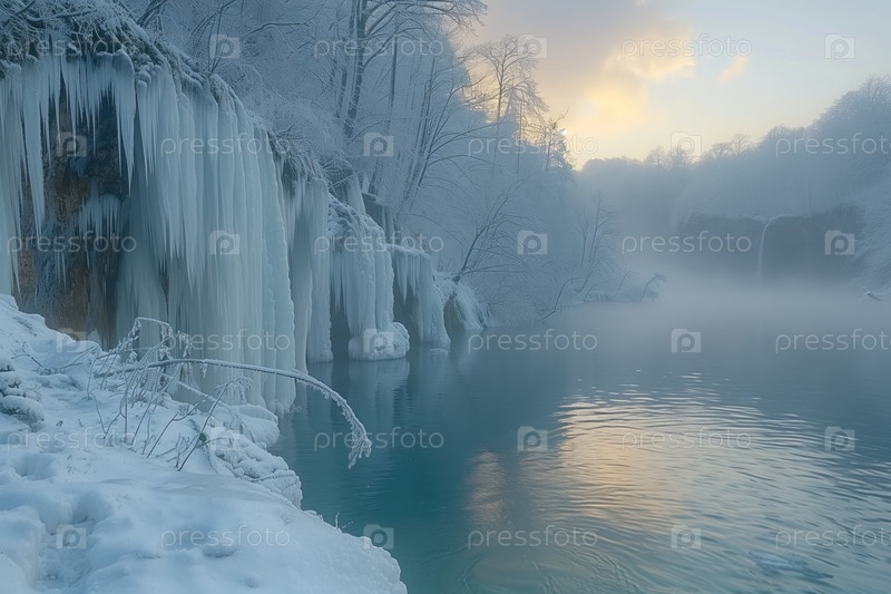 Зимний пейзаж с замерзшим водопадом и заснеженными деревьями туманным утром