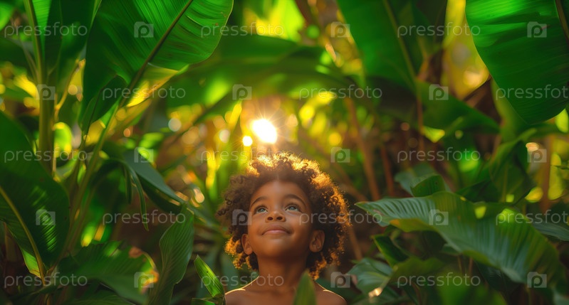 Счастливый африканский мальчик среди тропической растительности, детей и природы
