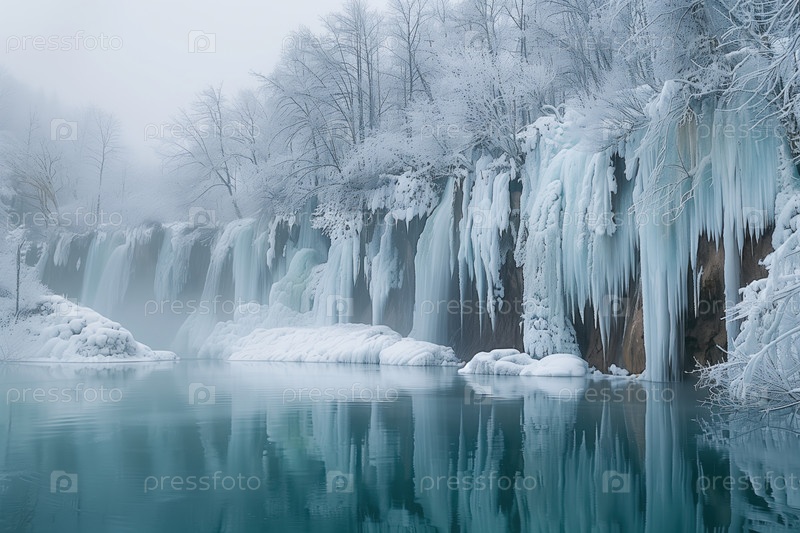 Зимний пейзаж с замерзшим водопадом и заснеженными деревьями в холодную туманную погоду