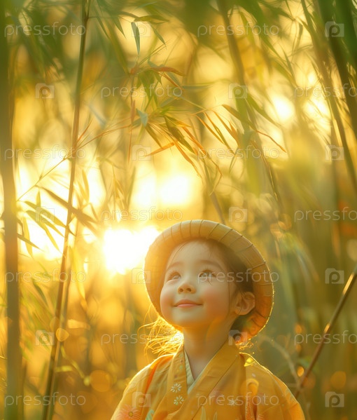 Счастливая маленькая азиатская девочка среди бамбуковых стеблей, детей и природы