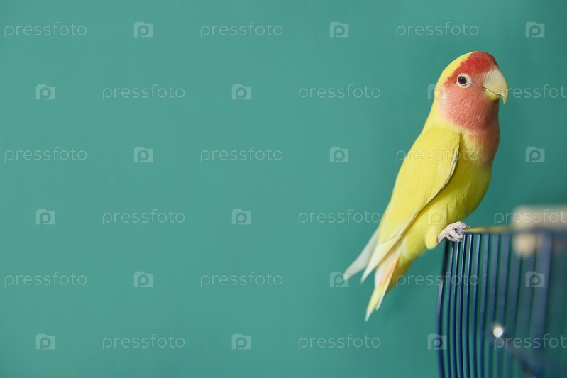 Желтый неразлучник удобно расположился в клетке на ярком зеленом фоне, демонстрируя свое красочное оперение. Яркие желтые и розовые оттенки птицы прекрасно подчеркнуты