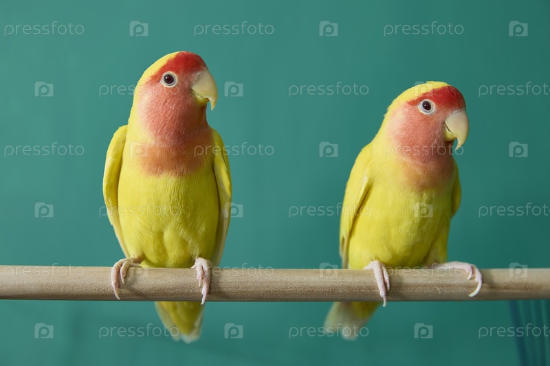 Два ярких желто-красных попугая сидят на деревянной ветке на зеленом фоне. Их яркое оперение и любопытные выражения создают живую и веселую сцену. Розовощекий неразлучник