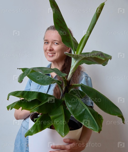 Портрет улыбающейся женщины, держащей банановое растение в горшке и ухаживающей за зеленью в доме