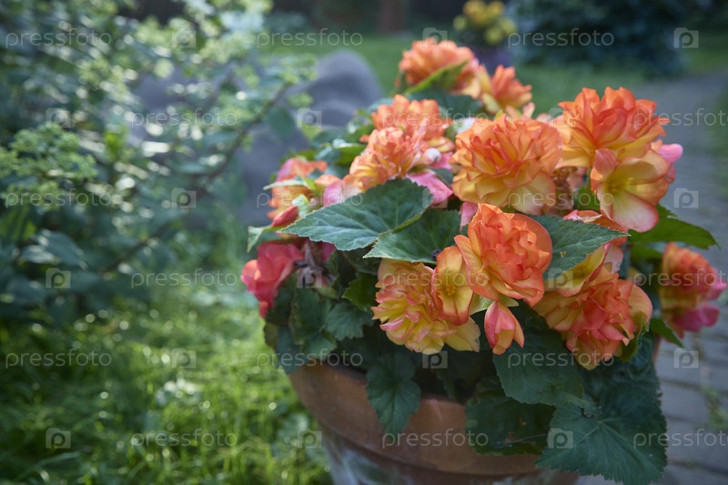 Бегония Элатиор (Begonia x hiemalis) с красными и розовыми цветами. Сорт «Сансет». Цветковое растение семейства Бегониевые. Гибридная бегония с эффектными махровыми цветами