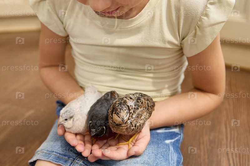 Ребенок нежно и с большой заботой держит очаровательных и милых птичек в своих крошечных ручках. Обыкновенный перепел