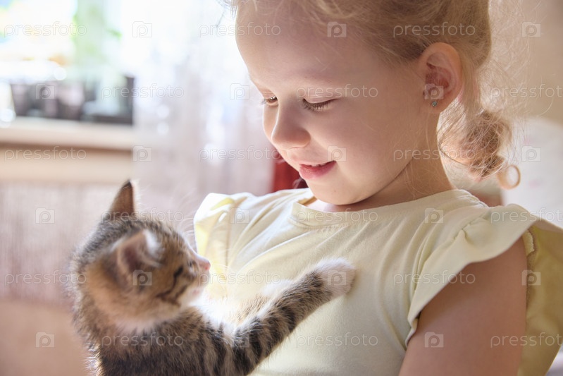 В залитой солнцем комнате девочка прижимает к себе милого котенка, наслаждаясь их связью любви и радости