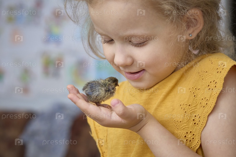Девочка играет с маленькой птичкой. Дружба животных и людей