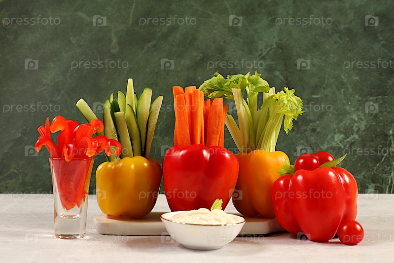Концепция сыроедения и диетическое питание, Овощные палочки в болгарском перце и соусе для похудения, прерывистое голодание. Здоровый завтрак с ингредиентами, меню для кафе или ресторана, фон кухни,