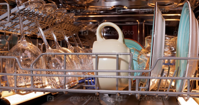 Открытая посудомоечная машина с чистой посудой. Концепция уборки