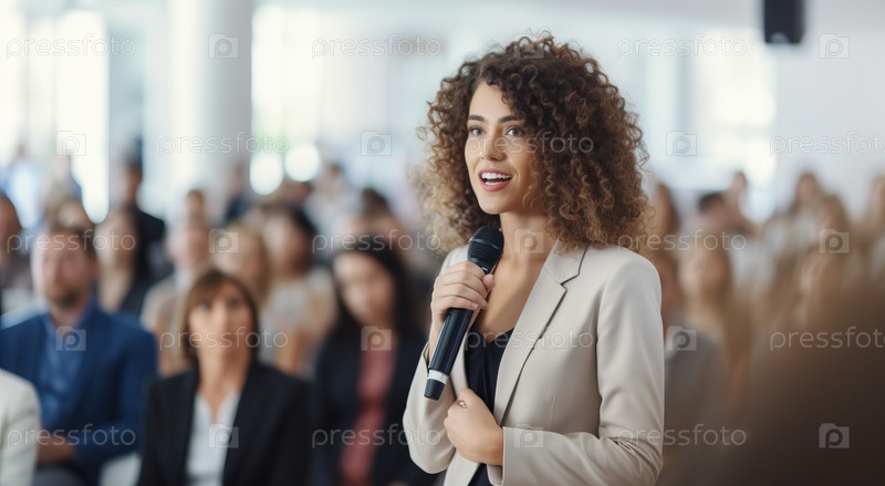 Девушка-лидер стартапа выступает на питч-сессии, вид сзади