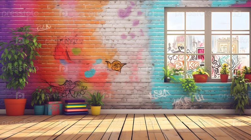 Цветы в горшке на фоне красочного граффити на стене