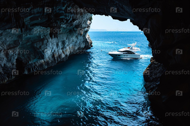 Роскошная яхта, проходящая через Голубую пещеру в живописном месте отдыха на море