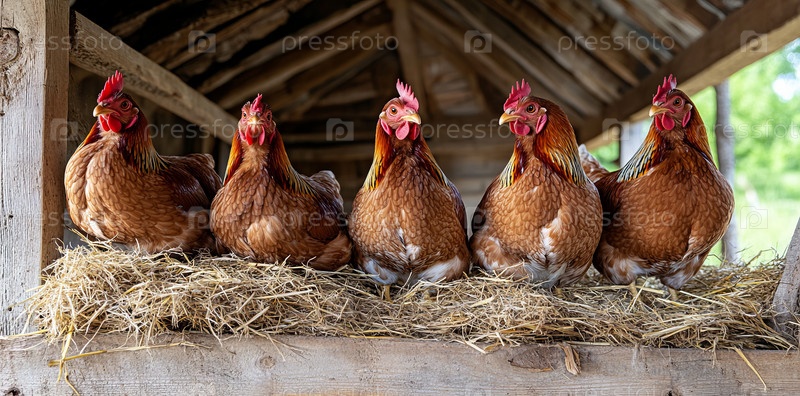 В тепле деревенского амбара куры собираются вокруг только что снесенных яиц, олицетворяя мирную сущность сельской фермерской жизни