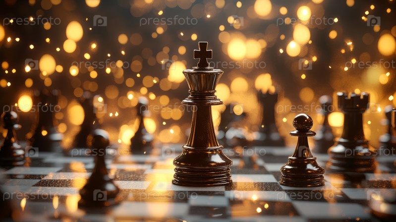 Шахматный король величественно возвышается среди тлеющих углей, символизируя стратегию и победу