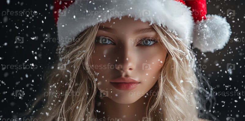 Женщина в шапке Санты стоит среди мягко падающего снега, олицетворяя праздничную радость и тепло предпраздничного сезона