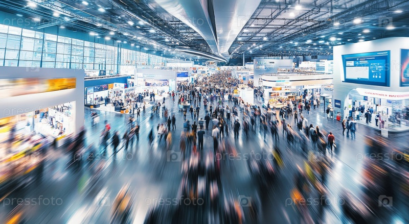 Оживленный выставочный зал, заполненный динамичными экспозициями и толпами, передающий живую энергию и инновации современной торговой выставки