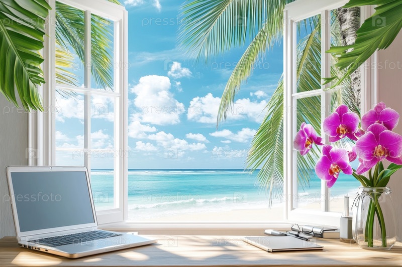 Безмятежное тропическое рабочее пространство с видом на океан, ноутбуком и орхидеями