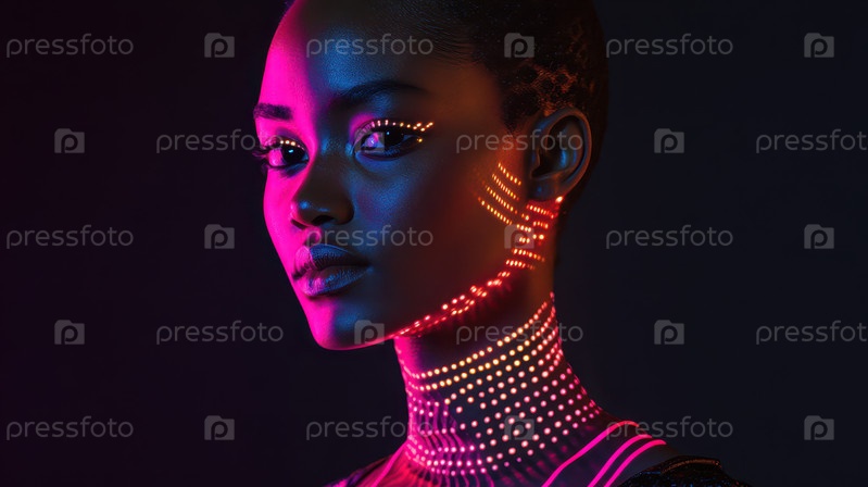 Женщина-киберпанк с неоновыми лицевыми имплантатами