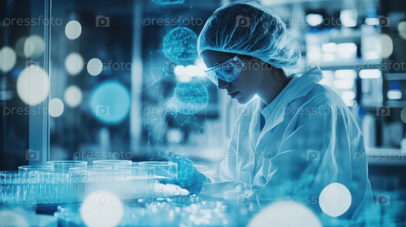 Сосредоточенная женщина-ученый в белом халате, защитных очках и перчатках осторожно проводит эксперимент со стеклянной посудой в современной лаборатории