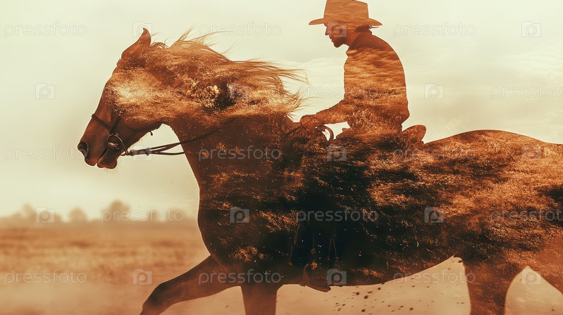 Драматическая двойная экспозиция ковбоя верхом на лошади в сочетании с яркими текстурами, вызывающая ассоциации со свободой, приключениями и духом Дикого Запада