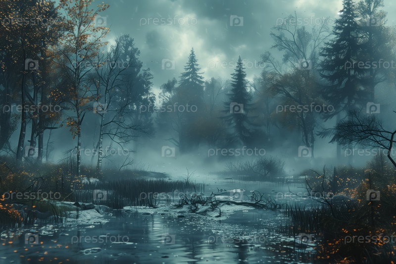 Туманное утро на реке в осеннем лесу. Пейзаж