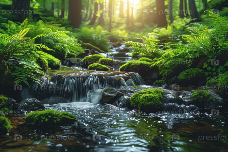 Красивый водопад в мшистом лесу с зелеными папоротниками и солнечным светом