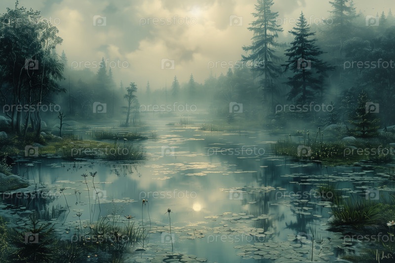 Туманное утро в лесном озере. Пейзаж с туманом и деревьями