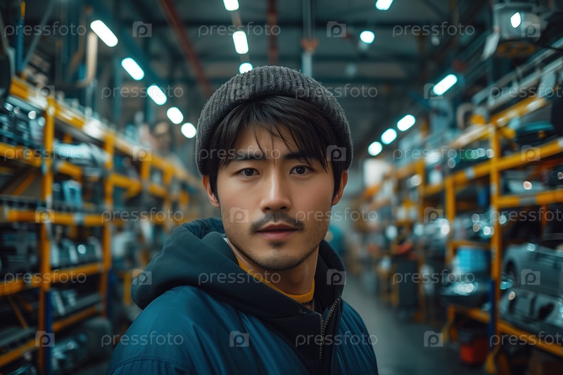 Портрет азиатского мужчины-работника, смотрящего в камеру на складе, в сфере грузоперевозок и дистрибуции